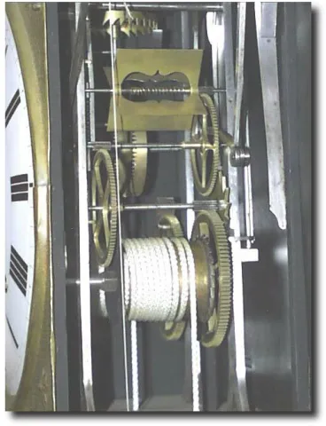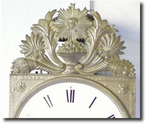 Case: Brass wag on wallw ith 8" porcelain dial, hammered brass top; 15" high x 9.5" wide.. Works: 8 day with striking count of the hour with standard ...