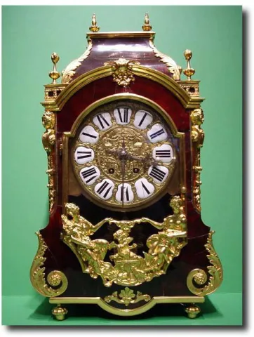 French ormolu mounted tortoiseshell boulle clock in a Renaissance style. 8-day French square plate movement chiming hours and half hours on the bell w...