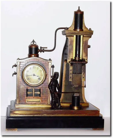 C.1880, French, the "Forgeman' Time and Strike mystery clock, from the French Industry series. This is a nice original example with old patina. Through a complex series of linkage, the oscillating movement of the crutch is converted into the up and down movement of the hammer forge, but amazingly the forge stands 6 inches to the right of the clock, and separate from it. The forgeman is seen holding his iron piece on the anvil while the hammer makes impact. The clock is inset in a "brick' firebox and boiler, and appear to be sending steam impulses to the large steam cylinder and forge to the right. A "sister" to this clock may be seen in A Collector"s Guide to Clocks, by Derek Roberts (1992), page 103. Height 17'