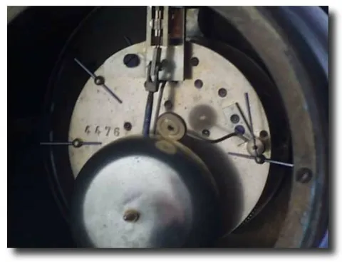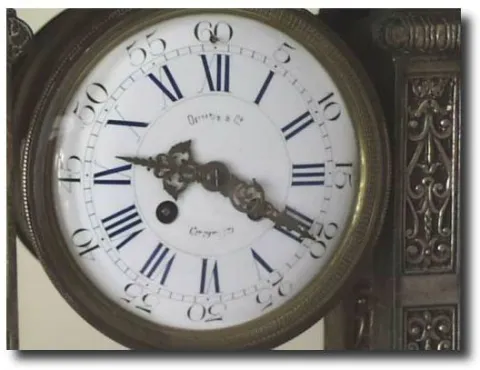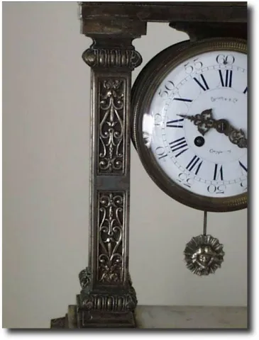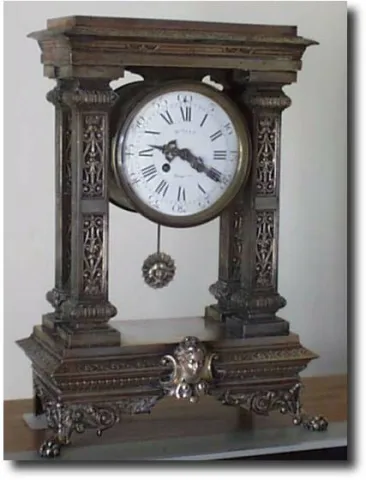 Case: Cast metal case with silver finish. 17" tall Works: Japy Freres and Cie, Gde MED. D'HONNEUR. 8 day time and strike on bell. Reference:The French...