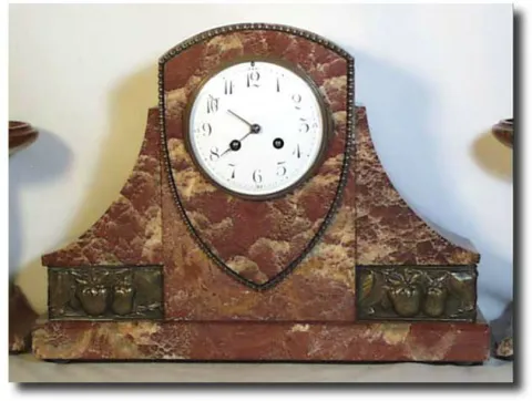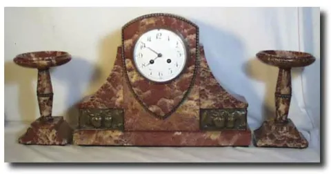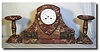 Case: Rouge Marble with pair of matching tazza. Clock 12.5" tall x 16.5" wide Works: Samuel Marti marked Medaille d'Or , Paris 1900. 8 day time and st...