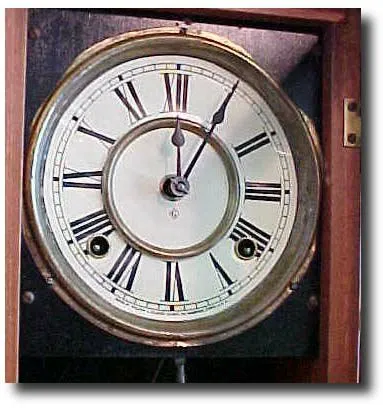 Unusual maple case. Eight-day movement strikes the hour and 1/2 hour on a coiled gong. Additional keywords: mantel, mantle...