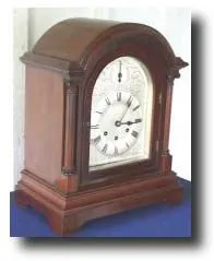 Case: Mahogany with corinthian columns 16.5" high. Works: Gustav Becker Time and Westminster Chime on two sets of rods. Condition: Case: Excellent; Wo...