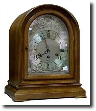 Mahogany case with silvered dial. Eight day movement with chimes every 15 minutes. Excellent running condition. Manufactured in Cincinnati, Ohio, circ...