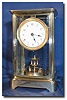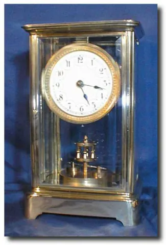Case: Polished brass with bevel glass. 11 inches tall. Porcelain dial. Works: Built to run a year on each winding. Rotating pendulum Condition: Case: ...