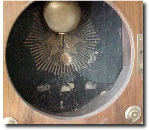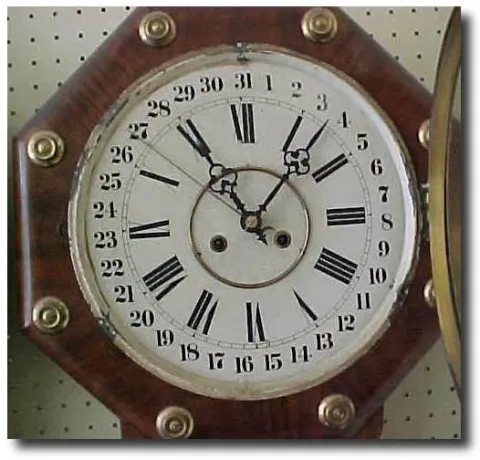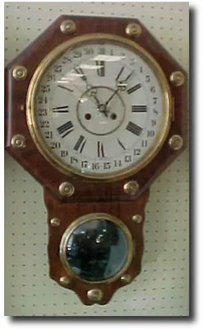 with brass fittings by Junghans Clock Co Germany. Eight-day movement with simple calendar strikes the hour and 1/2 hour on a bell. Additional keywords...