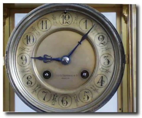 Case: Original gold finish on brass. Beveled glass. Works: French 8 day time and strike on gong. Reference: French Marble Clocks by Thorpe Condition: ...