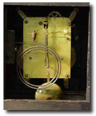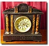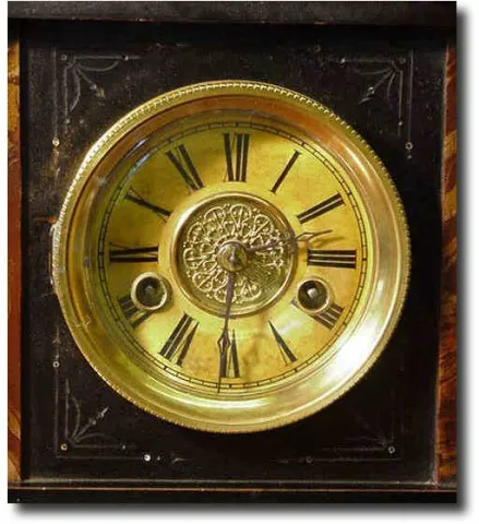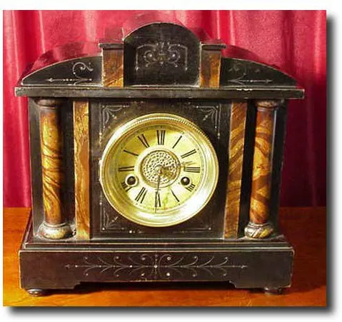 Victorian lacquered wood cased clock. Incised decoration and golden brown variegated faux marble columns. The dial is celluloid covered paper which ha...