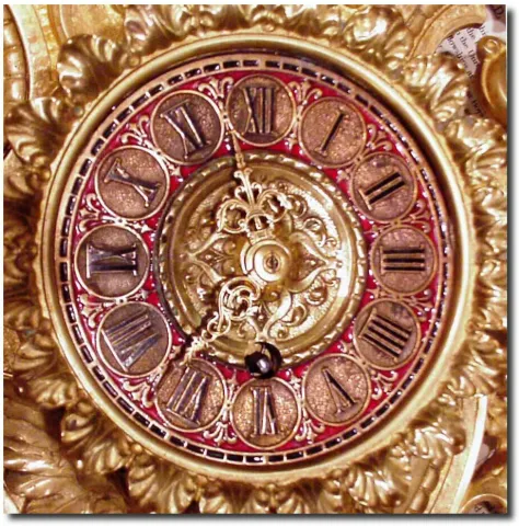 The fanciful frieze of scrolls and leaves features a wing spread owl below the fancy enameled dial (black and red). The pivoted pendulum movement sign...