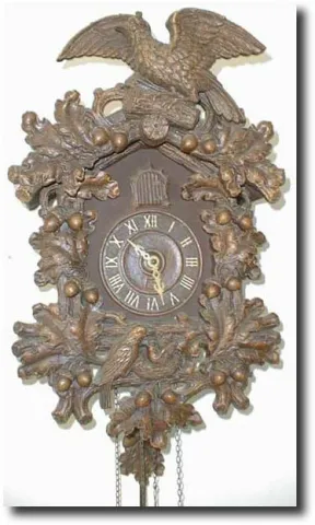 Case: Wall mounted; molded wood case. 16 " tall x 10 inches wide Works:Lux one day weight driven. Reference: Official Guide to Antique Clocks by Roy E...