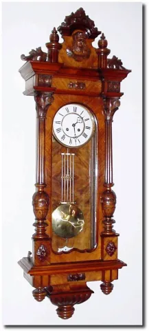 This is a nice, all original clock. A couple of leaf tips are broken away on the carved trim, and the pendulum bob has dents (order new one from Times...