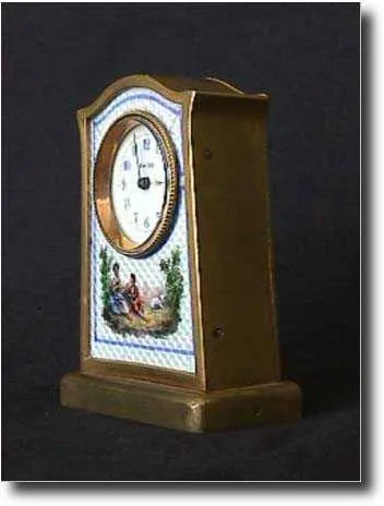 This is a miniature Swiss carriage clock with a Guilloche enamel front. The hand painted scene depicts a woman and youth in a clearing with a lamb. Th...
