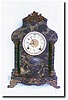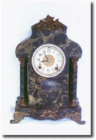Porcelain dial in good condition, beveled glass. Case: Metal with black/green marbled finish 12" h x 8.5 x 5. Works: New Haven 8 day time and Strike o...