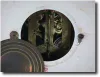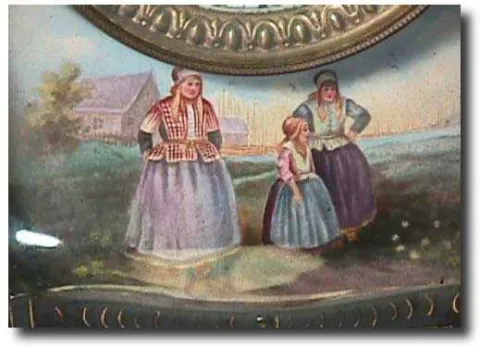 With a hand painted scene of Dutch women below the 5 " enamel dial. The case is dark forest green with gilt accents that makes this the most desirable...
