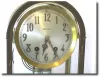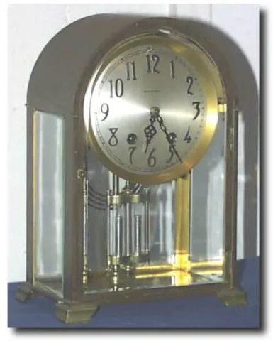Case: Cast brass and beveled glass with silvered dial, cut serpentine hands and raised bronze numerals. faux mercury pendulum. 11 inches tall. Works: ...