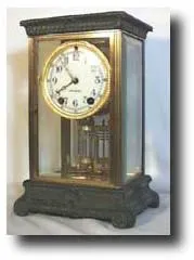 Comm Case:Brass with gold plate. Verde Bronze base and top band. Porcelian dial. 11 inches tall. Works:Seth Thomas 8 day time and strike on gong Refer...