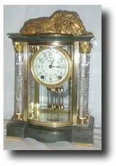 Case: 4 cut glass columns. Much of the original gold finish remains. Convex front with beveled glass all around. Seth Thomas verde finish on base and ...