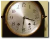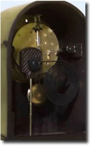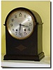 Case: Mahogony veneer with inlay. 10 inches high Works:Seth Thomas 8 day time and strike on gong. Condition:Case: Good, Some aligatored finish remains...