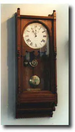 Cherry case, 38 1/2" tall, 8 day time and strike, dated Nov. 1885, repainted dial, overhauled, two year warranty....