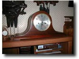 Walnut veneer case with brass movement and silvered dial; with a Westminster quarter chime. 10" high x 20" wide at the base; excellent clean movement ...