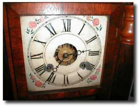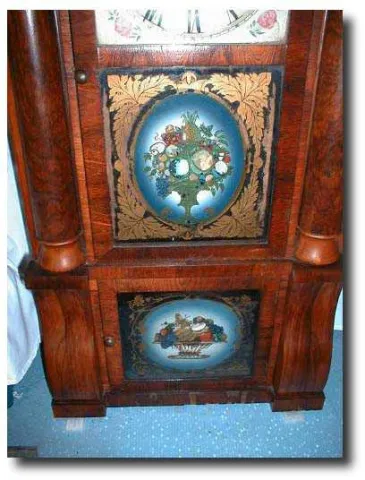 Rosewood veneer case with reverse painted door glasses and hand decorated dial painting; brass movement and cast iron weights. 32" tall x 18" wide; co...