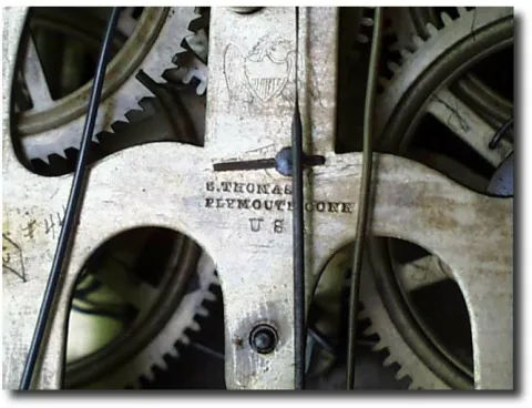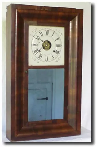 Case: Mahogany veneer O.G. style, 29.5" high. With great original label. Works: Seth Thomas Lyre type 8 day weight driven. Eagle stamped on works. Ref...