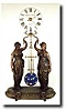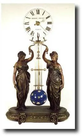 the swinging arm held aloft by double female statues. The movement is in the star studded ball at the bottom of the arm, and powers the arm, suspended by a normal suspension spring. A separate miniature gravity movement is in the center of the glass dial, with a tiny pendulum and ratchet that advance the well balanced hands with each swing of the arm. This clock has been professionally restored, and the ball and statues attractively refinished. It is in running order. Numerals on dial are gold leaf, but appear brown because of back lighting in photo. Dial diameter is 7 inches (17.8 cm), overall height is 26" Reserve $15000