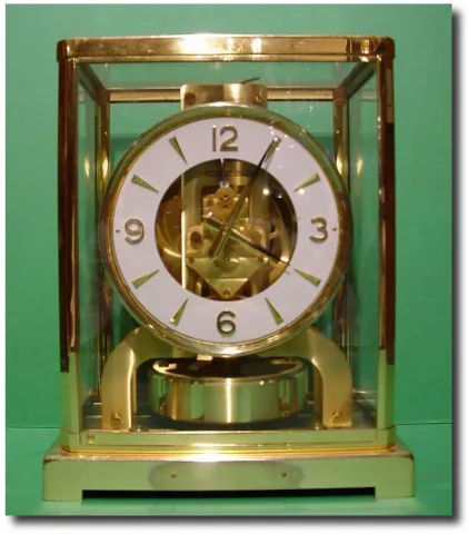 Swiss Jaeger-leCaultre atmos timepiece. White chapter ring with gilt arabic numerals. Signed "Swiss made". (this clock never needs winding). 9" x 7" x...