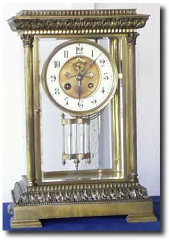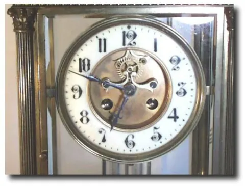 Case: Cast brass with great detail and beveled glass with porcelain dial and open escapement with jewelled pallets. Corinthian columns and detailed ca...