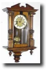Case: Wood veneer with nice carved columns; 22" high Works: Eight day time and strike on gong with crossed arrows trade mark which date the clock as b...