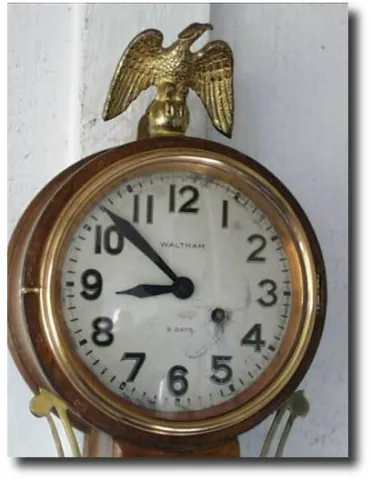 Case: Walnut 19.5" tall. Works: Waltham jewel 8 day movement large watch type lever escapement movement. Condition: Case: Good; dial has some scars an...