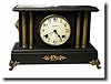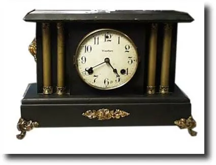 Black Wood cased clock is circa 1900. Original signed Waterbury arabic numeral dial, and the movment is an eight day hour and half hour strike. Two co...