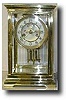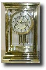 Case: Brass and beveled glass, h 11 inches, w7". Works: Brass 8 day works with Open Escapement . Chime hour and half hour on Gong. Open escapement wit...