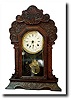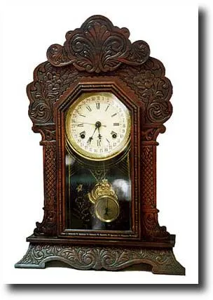 Circa 1875. Pressed oak case. 8-day hour and half-hour striking movement with day of month calendar. Features original reverse painted glass. Dimensio...