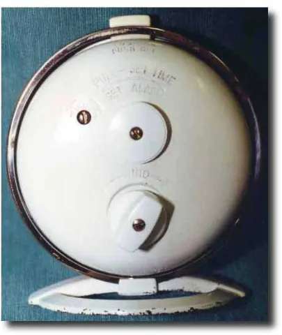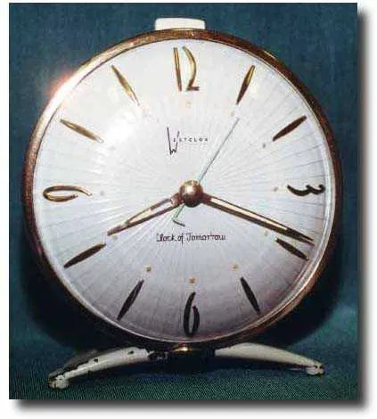 Westclox Clock of Tomorrow in white case. This clock with futuristic styling is dated November 1955 on the movement. It has the chime alarm feature ("...
