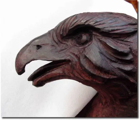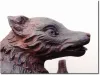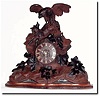 C.1880, Swiss for the French market, a carved figural clock, showing an eagle attacking a wolf. The carving is very nice quality; an oak leaf and a couple of small wing tips are broken away and stained in, but it looks very good as is. The dial is missing Roman numeral "X' (brass job), and the hands do not fit properly. Retains original round French bell-strike movement (needs cleaning), serial no. 5944 and matching no. pendulum. Width 20', ht 19'