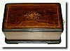 C.1880, Swiss, Music Box with 5 bells and bird strikers. This box plays 6 lively tunes with virtually no damper noise and there are no broken teeth. There is a haze of rust on the comb and the 8" cylinder is dark, but the pins are still quite good. The rosewood veneer on the box is still intact, with some minor blemishes, and some bits of string inlay missing. But overall I would classify this as "very good plus" and a box that anyone can enjoy immediately owing to its' excellent sound. Includes on-off lever for bells. Width 19" Height 8 " Reserve: $2250