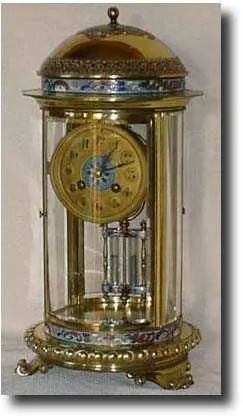 Unique 4 glass with round gilded brass case liberably decorated with cloisonne panels and features, including the mercury pendulum. A very rare format...