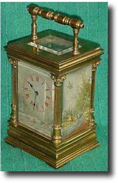 Carriage clock with hour repeat. Dial and side panels, engraved, silvered and hand coloured. French c1900...