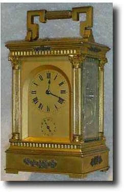 Grande Sonnerie carriage in classic pillared ormolu case - with Grande sonnerie alarm and gilded arch dial - striking on two gongs - French c1890...
