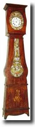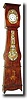 in good original condition, porcelain dial signed Saunier. Some of the glue joints are loose in the case and there is some minor worm damage (no current activity). Retains original painted surface in good condition (with some wear and scrapes). The large 2-weight movement has an iron frame with steel side doors. Dial surround and pendulum with matching motif, with accent paint in red, white and blue. The movement has been serviced and re-strung and is in operating order. Perfect for someone with country-French décor. Height 92" $1200-1800