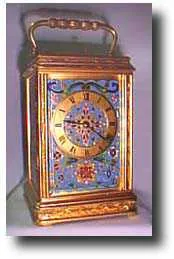French engraved bright gilt brass gorge cased cloisonee bell strike and repeat carriage clock. Case Excellent Hight 5.5" excluding handle Dial Excelle...