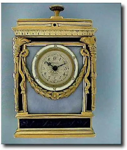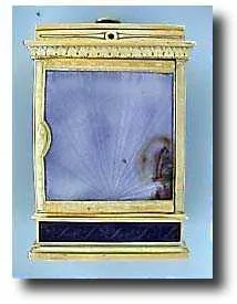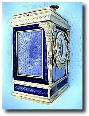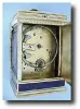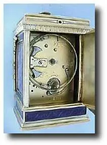 Silver gilt and enamel miniature minute repeating carriage clock. Richly chased cast case decorated with light and dark purple enamel over engine turn...