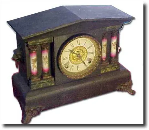 Time and Strike, Original Black Enamel Finish, 4 pillars with pink and white Cherub motif; 16 in X 11 3/4 in...