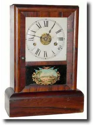 ebonized wooden cased mantel clock with decorated rubber panels, and in generally good original condition, wear to decorations commensurate with age. ...