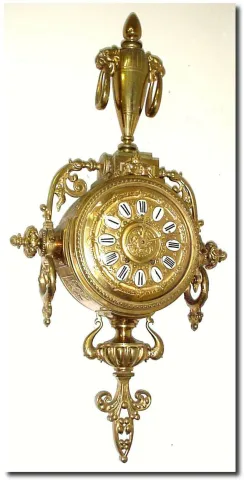 C.1885, French, a Large and Heavy Brass Cartel clock in very good condition. You"ll need a lag screw to hold up this brute. Retains original rectangular solid plate pendulum movement, and brightly gilded hands (they do not show in image, as the dial is gilt as well. Original porcelain numerals are in perfect condition. An impressive piece. Height 34'