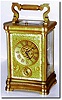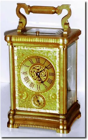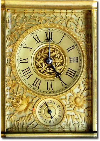C.1885, French, Brass Cased Carriage Clock, a stylized Angle Riche case with a gorge style bottom, all 4 sides slightly convex, and with a wonderful floral mask over the gilded dial. The mask is finely pierced and then engraved with vines and flowers. The dial retains original gilding and the signature of Theodore B. Starr, New York. The gilding on the outer case is about half rubbed off, but the quality is very nice and the case is worthy of regilding. 8-day, time/ strike/repeat, and alarm. See a cousin to this case in Christie"s catalog for Oct 28, 1991, lot 155. Height 7.3'