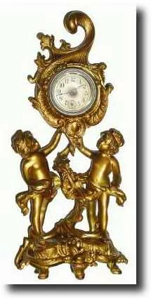 Bridgeport, CT Cast white metal novelty clock, gilded. The paper dial has turned dark around the center shaft. The case is in good condition with no b...