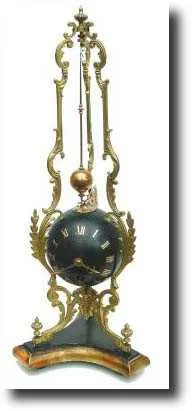 The movement is contained in a brass sphere, painted dark green, and retains original signature of E. Guerrin a` Chaumont. The pendulum is suspended from a silk yoke and rotates above the movement. The trefoil base is gilt wood with ebonized center. The movement appears to be clean and the clock is running (these are not perfect time-keepers). In excellent original condition. Height 15" $2000-2500