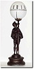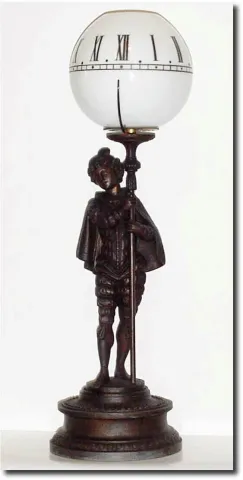 C.1885, French, Figural Night Clock, the 8-day platform movement in the base, driving the globe through the staff in the man"s hands. The patinated bronzed spelter gentleman in 18th century dress. Time only movement is clean and running. Note the glass globe with annular dial rotates twice per day, lit by a candle at night (candle not included). A single hand points to the time. Height 18'